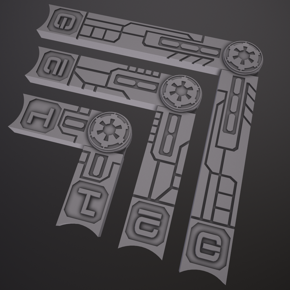 Custom movement template 3D models for printing designed to be compatible with Star Wars Legion. Templates come with emblems inspired by the Star Wars universe.